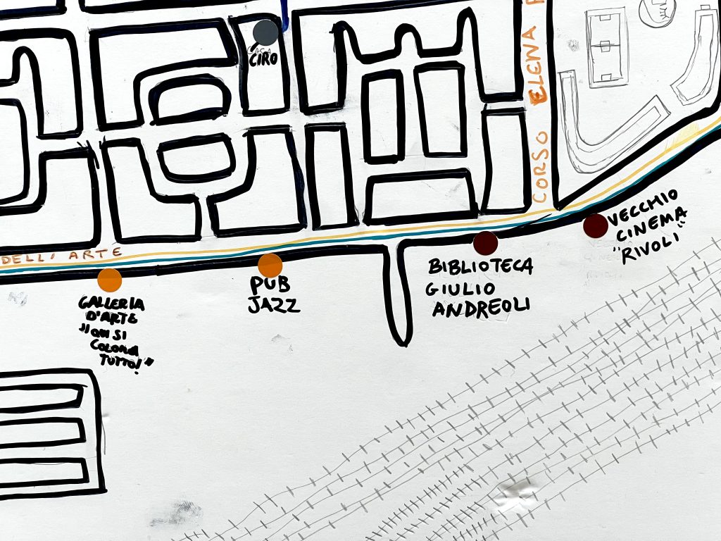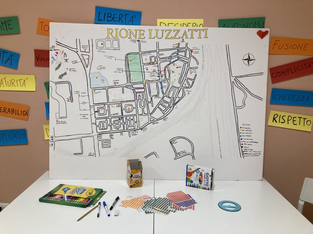 Ci siamo procurati un pannello di carton plume e con l’aiuto di un proiettore abbiamo iniziato a creare la mappa del quartiere. Subito dopo è stata la volta della legenda e ci siamo sbizzarriti ad attaccare bollini colorati per segnare tutti i luoghi a noi importanti. Per finire, con dei pennarelli colorati abbiamo tracciato i nostri percorsi più frequenti, ad esempio: casa-Base Camp, casa-scuola, casa-oratorio, etc…